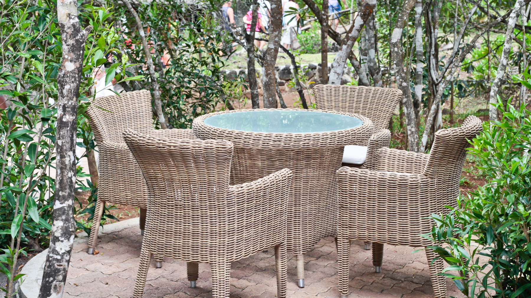 Available in a grey wicker weave with grey cushions, the table is topped with safety glass and the chair and table legs are made from powder-coated aluminum.