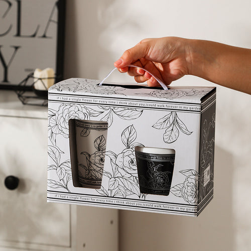 This set includes two ceramic camellia coffee mugs in black and white. The black mug measures 8.7cm in upper diameter, 5.8cm in bottom diameter, an...