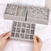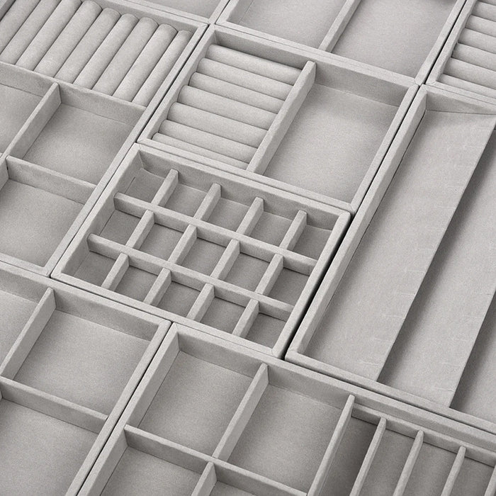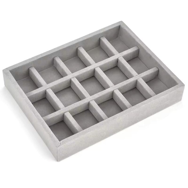 The fifteen-grid configuration offers meticulous organisation, with each compartment tailored to hold rings, earrings, necklaces, cufflinks, or other small accessories. Crafted from soft grey velvet, this organiser tray provides a plush surface that cushions and protects your jewellery from scratches and damage. Removable dividers allow you to adjust the grid sizes as needed, making it easy to customise the layout for various pieces.
